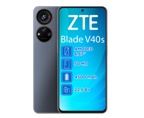 Смартфон ZTE V40s 6/128GB Dual Sim Black; 6.67″ (2400×1080) AMOLED / Unisoc Tiger T618 / ОЗП 6 ГБ / 128 ГБ вбудованої + microSD до 1 ТБ / камера 50+5+2 Мп + 8 Мп / 4G (LTE) / Bluetooth, Wi-Fi, NFC / GPS, A-GPS, GLONASS, Galileo / ОС Android 12.0 / 163.5×75.8×7.6 мм, 184.1 г / 4500 мАг / чорний